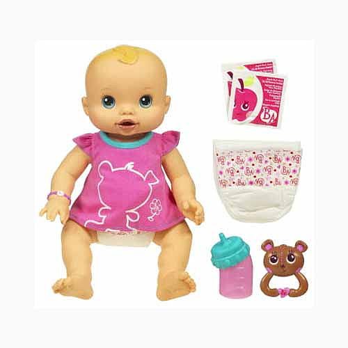 - Playing "mommy" is more fun than ever with this BABY ALIVE doll that "eats" and "poops" just like a real baby! Feed her or give her a bottle, and then get ready to change her messy diaper! Shell cry and kick when she needs a change and wiggle and coo when shes happyso youll always know just how your little one needs you to care for her!