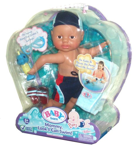 - Include : Baby Born Boy Swimming Doll, Beach Towel, Adorable Swim Shorts, Seahorse Water Squirt Toy, Pair of Sunglasses, Pair of Sandals, Swim Cap and Instructions